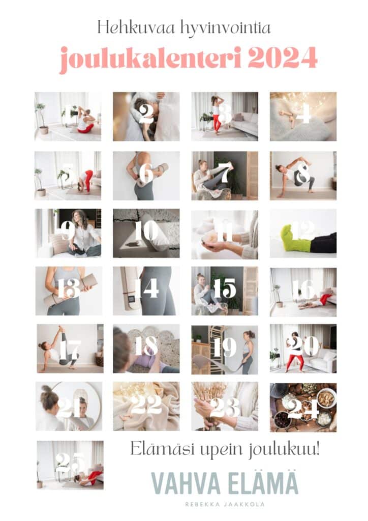 Hehkuvaa hyvinvointia -JOULUKALENTERI 2024 on myös täydellinen joulunaluslahja kaikille, jotka kaipaavat kokonaisvaltaista hyvää oloa.