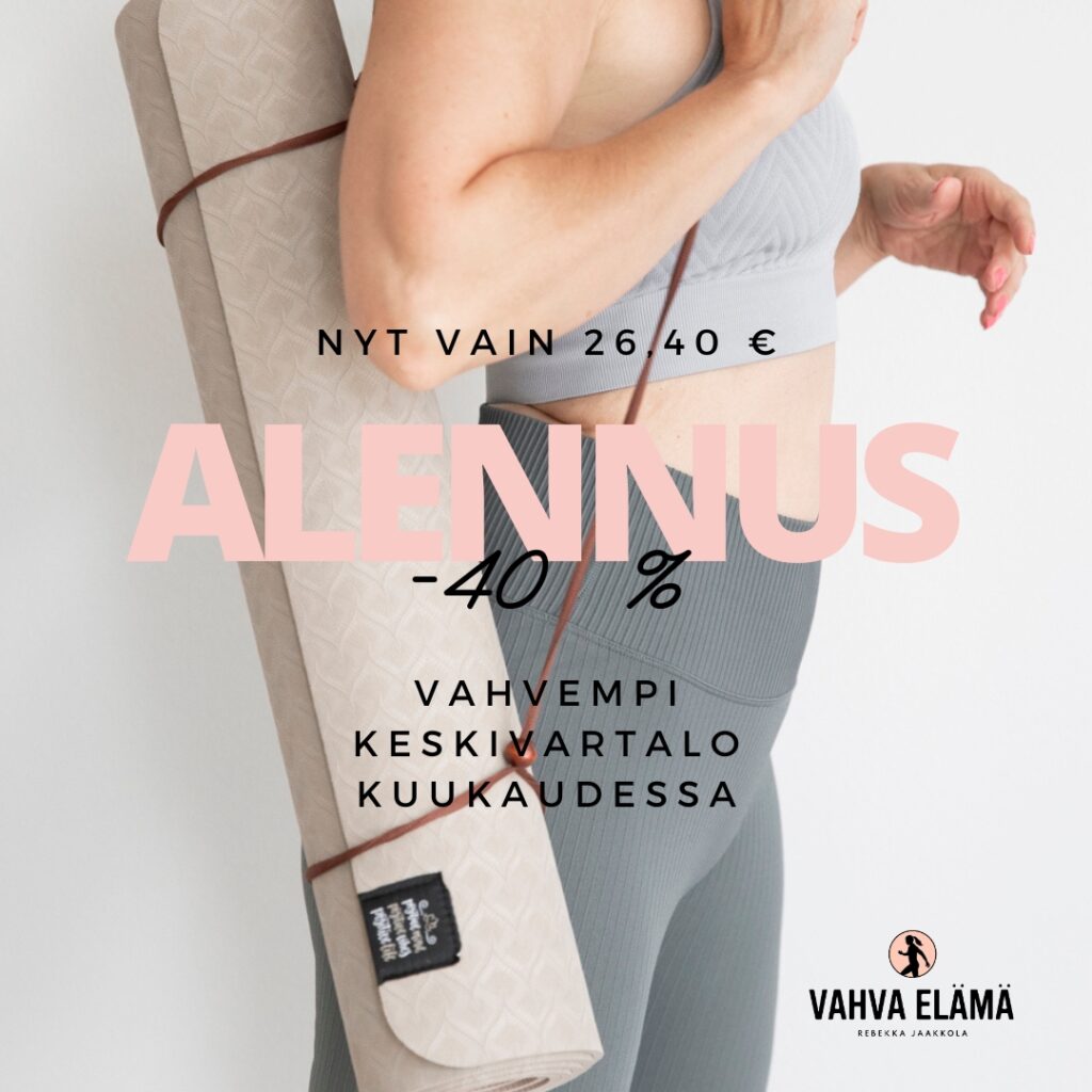 Vahvempi keskivartalo kuukaudessa -kurssi on – 40% alennuksessa sunnuntaihin 20.10. klo 23:59 asti. Kurssin hinta on VAIN 26,40 € (norm. 44 €) eli saat treenit melkein puoleen hintaan.